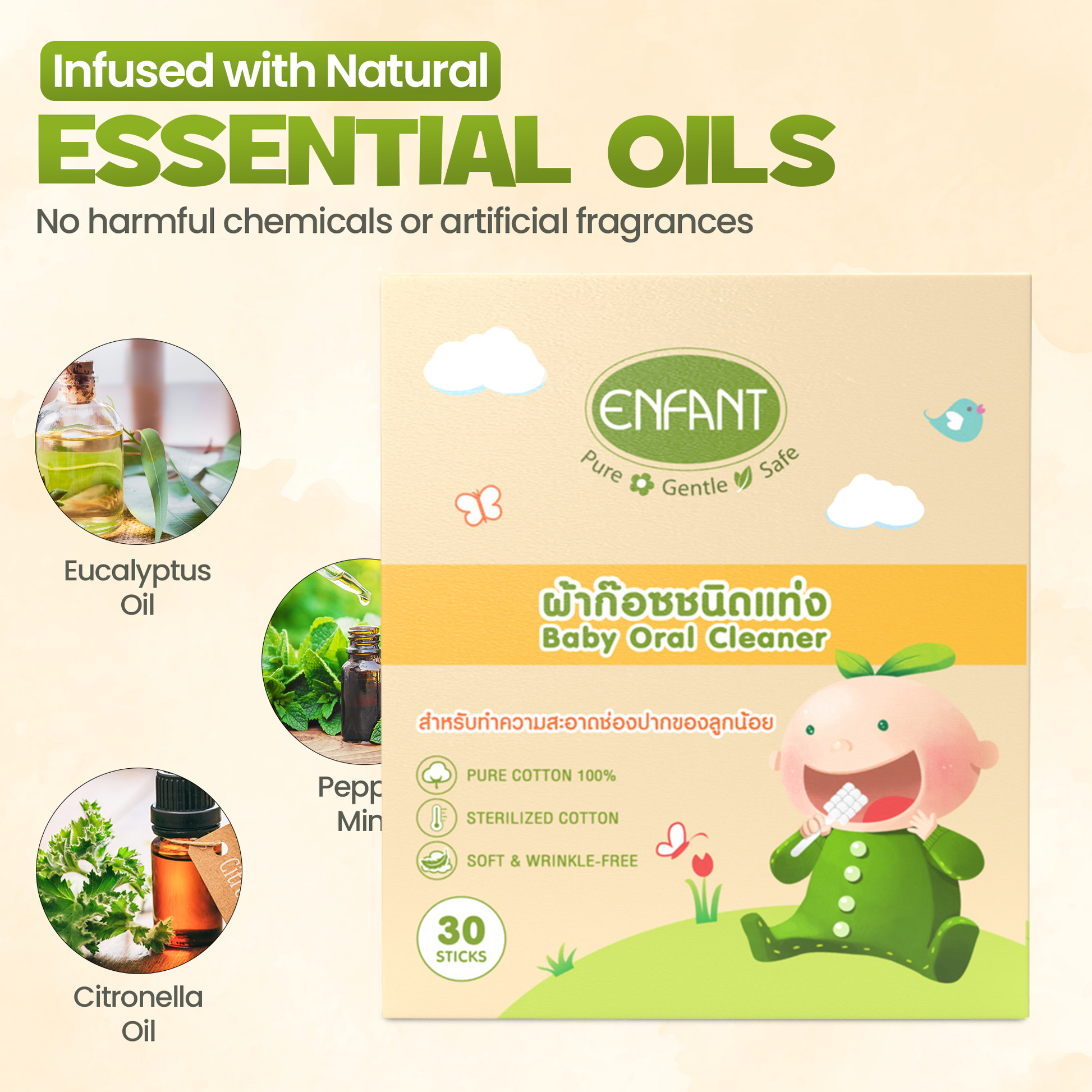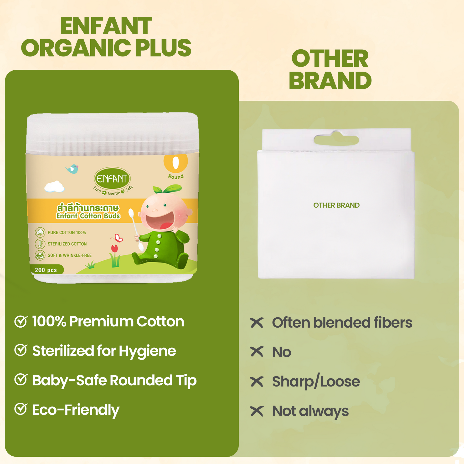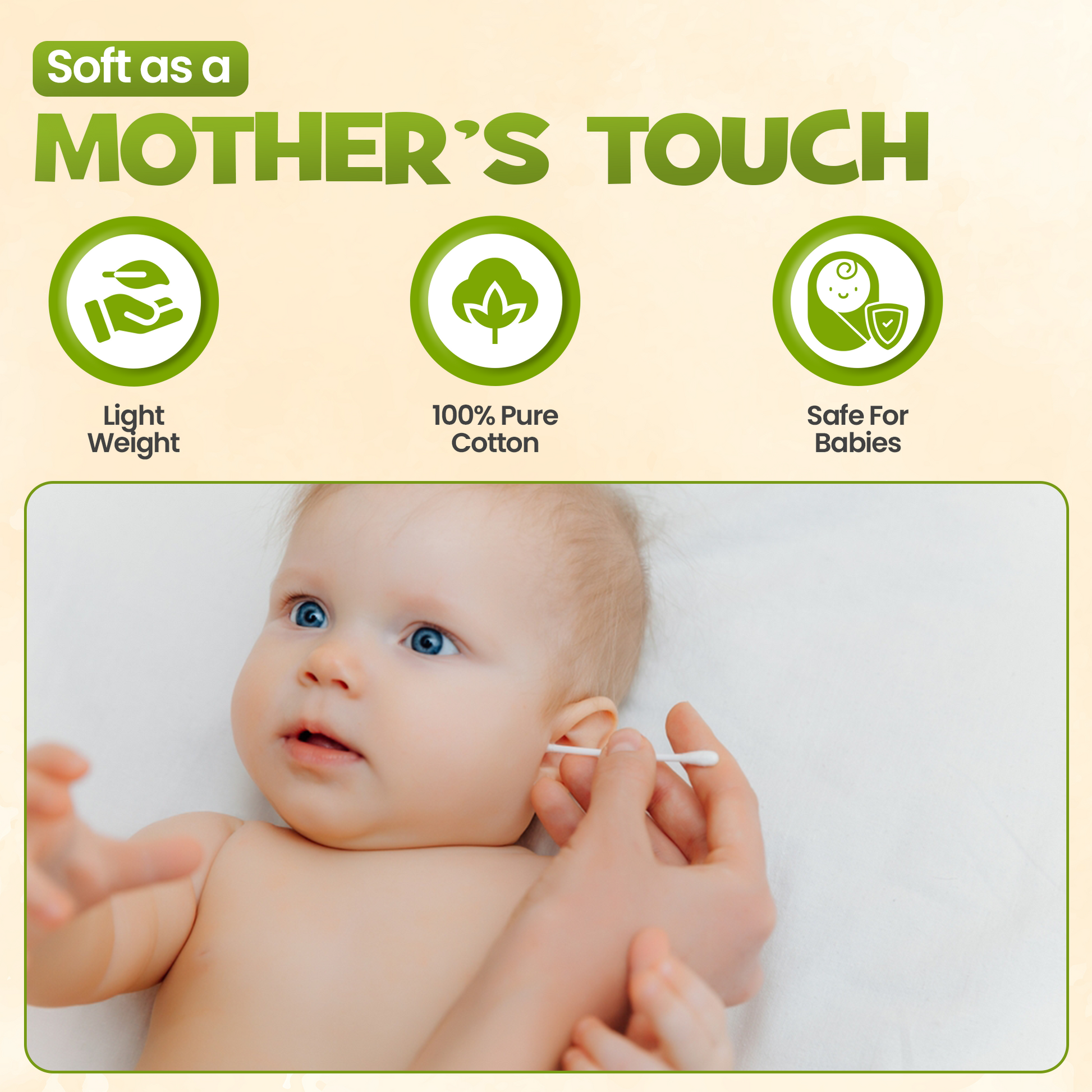 هذه الأعواد القطنية خالية من عوامل الحماية من الأشعة فوق البنفسجية والبارابين والمواد الكيميائية الضارة ، مما يجعلها مضادة للحساسية وآمنة حتى على أكثر أنواع البشرة حساسية. خضعت لاختبارات جلدية، وهي محل ثقة الآباء والأمهات في الإمارات العربية المتحدة وسلطنة عمان والمملكة العربية السعودية .