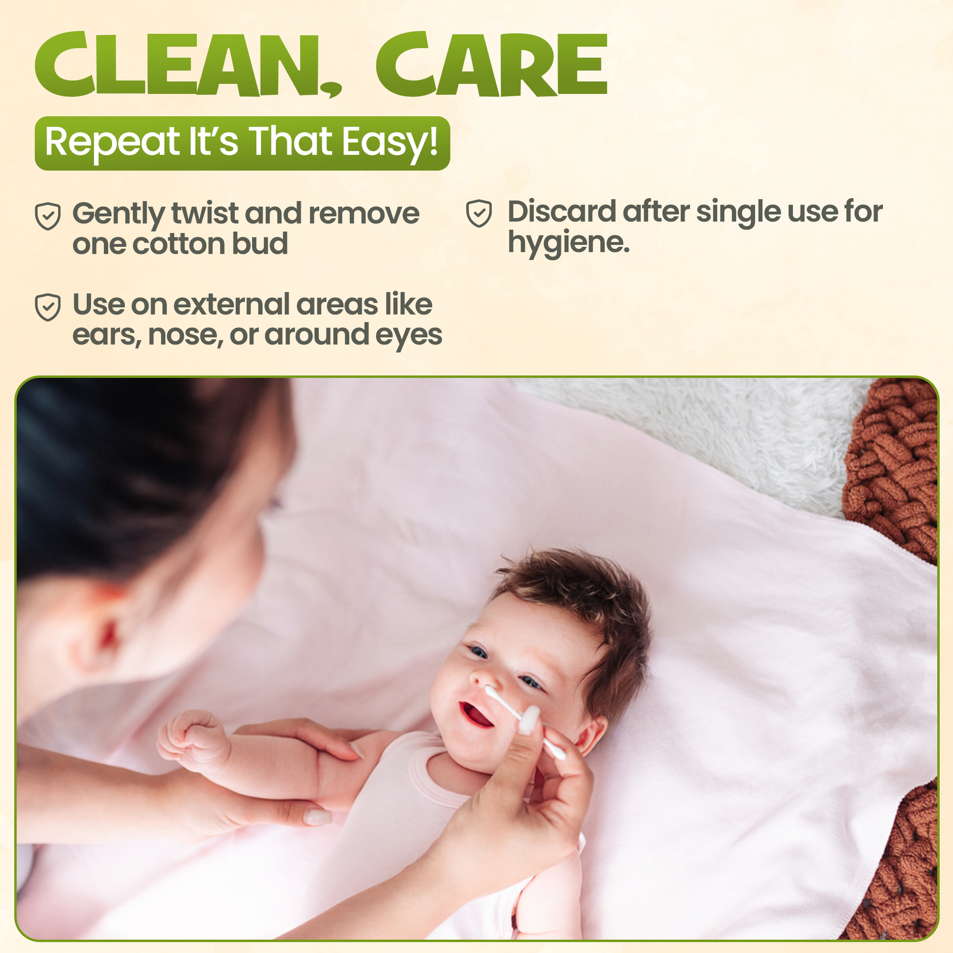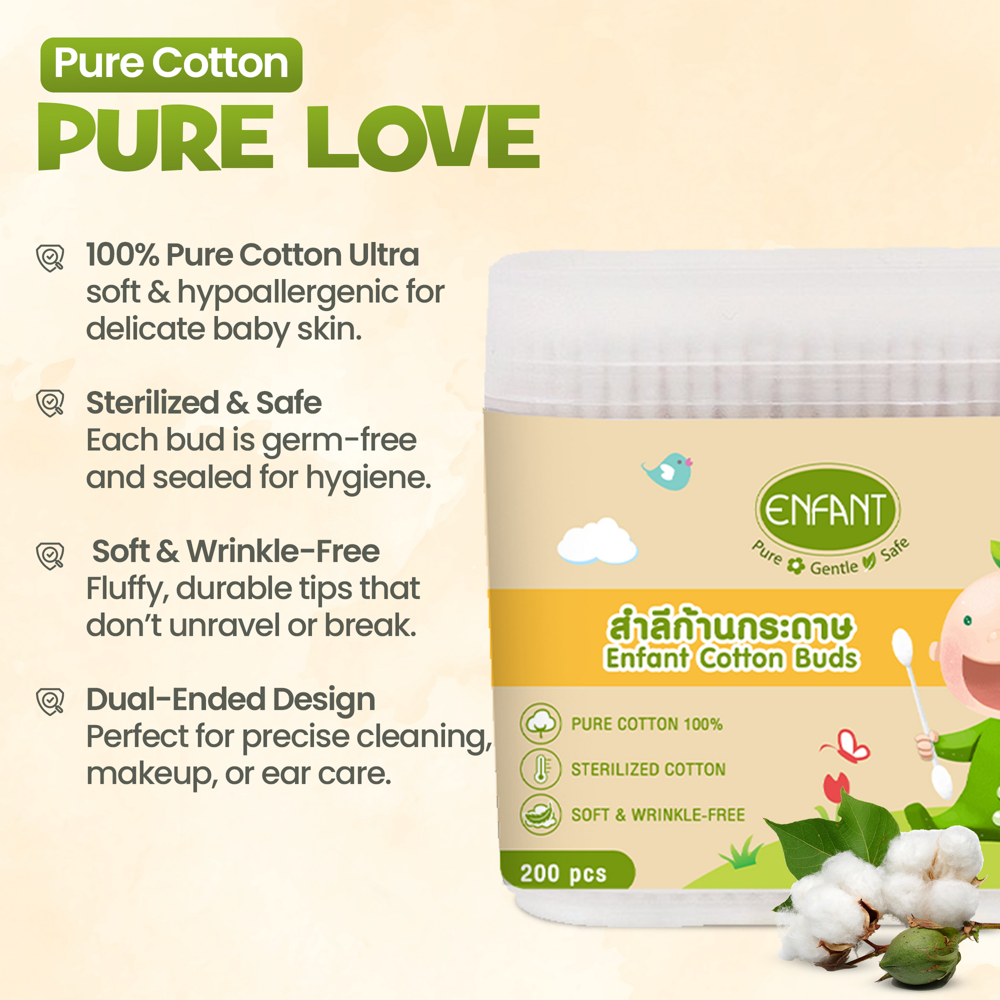 تتميز كل قطعة قطن بتصميم مزدوج الأطراف : طرف حلزوني للتنظيف الدقيق وطرف دائري للاستخدام العام . مصنوعة من قطن حريري طبيعي فاخر 100%، تتميز هذه القطع بامتصاص ممتاز مع الحفاظ على نعومتها على البشرة الحساسة. مثالية لتنظيف الأذنين والأنف والسرة، خاصةً للأطفال الرضع الذين يحتاجون إلى عناية ولطف إضافيين.
