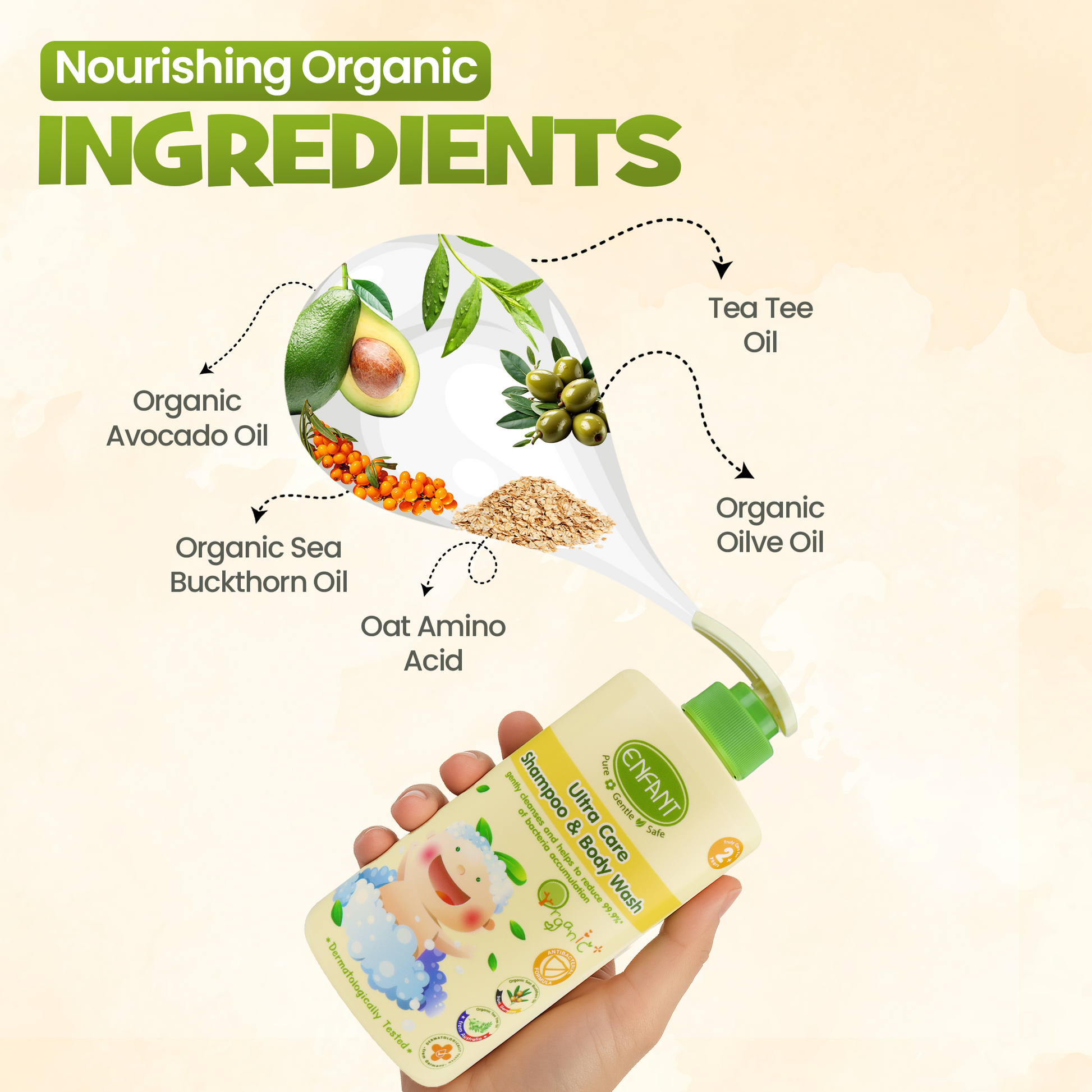 الشوفان العضوي وزيت الزيتون: تعمل هذه المكونات النباتية على تنظيف الشعر والبشرة بلطف وتوفير التغذية الأساسية لهما.