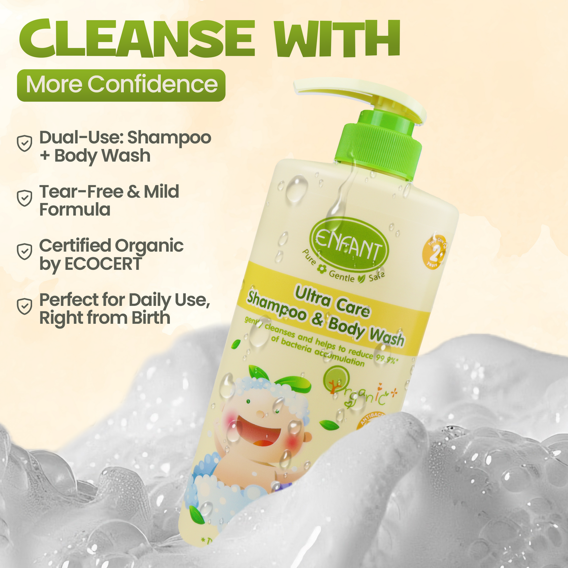شامبو وغسول الجسم إنفانت ألترا كير أورجانيك بلس هو تركيبة نباتية فاخرة مصممة لجعل وقت الاستحمام سريعًا وسهلاً وممتعًا، مع توفير عناية فائقة من أول قطرة. هذا المحلول المتوازن الحموضة مصمم خصيصًا للأطفال، مما يضمن أنه لطيف بما يكفي حتى على أكثر أنواع البشرة حساسية، ويحافظ على التوازن الطبيعي لفروة الرأس.